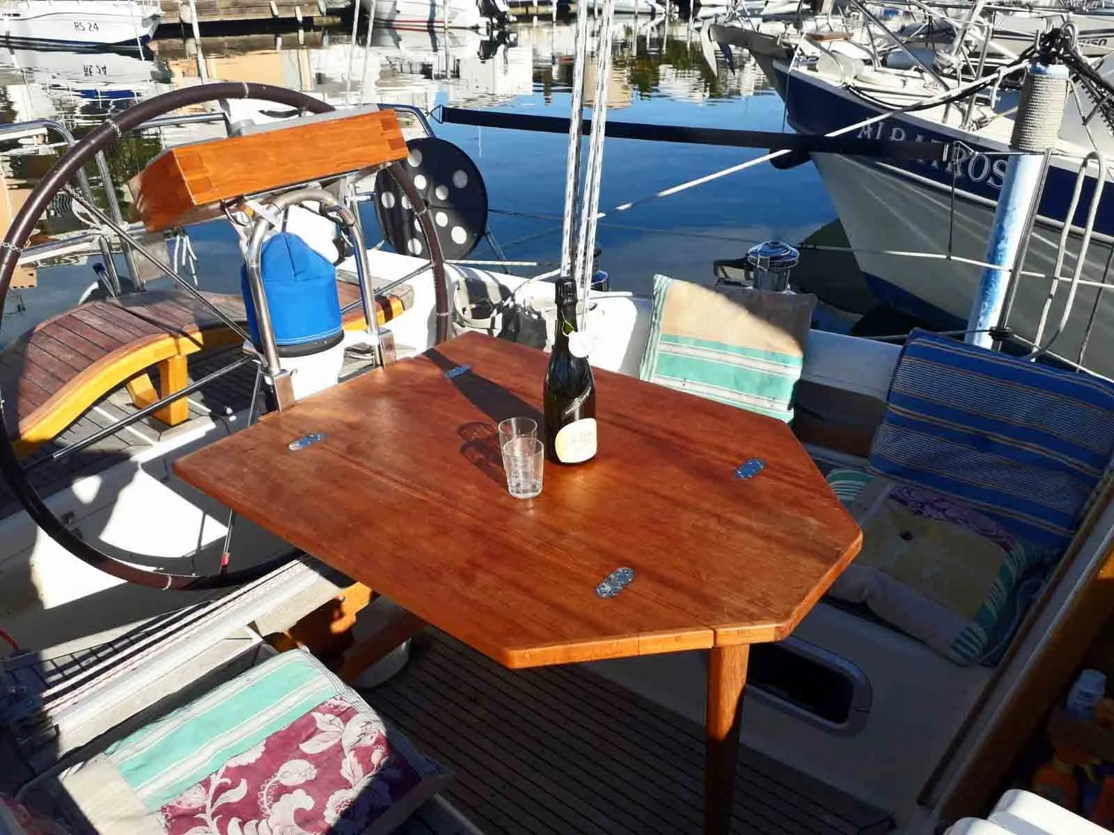 Möchten Sie auf unserer Segelyacht PADU einige Urlaubstage rund um meine Segeltörns verbringen und dort wohnen? PADU hat ein sehr gemütliches, sonniges Interieur. Der gesamte Innenausbau ist aus warmem Teakholz gefertigt. Sie hat einen großen Salon mit einer voll ausgestatteten Küche, einem großen klappbaren Esstisch mit einem U-förmigen Sofa, einem weiteren Sofa gegenüber und einem Navigations- und Arbeitstisch. Im Bug befindet sich eine Kabine mit einem großen Doppelbett, Regalen und zwei Schränken. Hinter der Küche im Heck befindet sich eine weitere Kabine mit einem großen Doppelbett, Regalen und ebenfalls einem Schrank. Auf der gegenüberliegenden Seite befindet sich das Bad.